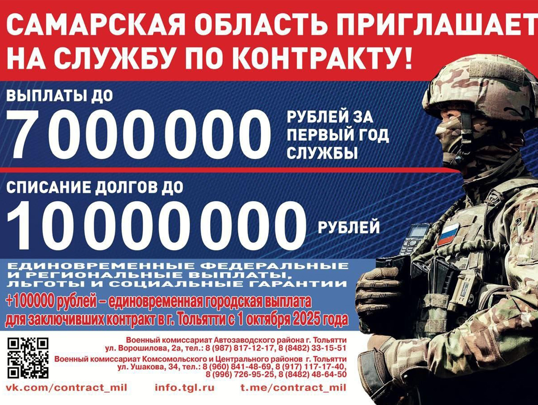 Самарская область приглашает на службу по контракту! С 1 октября — дополнительная выплата при заключении воинского контракта в Тольятти.